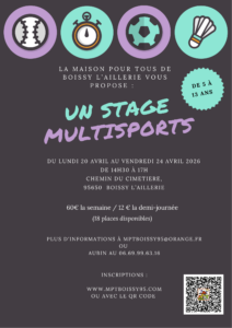 AFFICHE STAGE MULTISPORTS PRINTEMPS 26 v2 Publié le 24 mars 2026 par Maison Pour Tous par Maison Pour Tous Navigation de l’article du 20 au 24 Avril: Stage Multisports enfants
